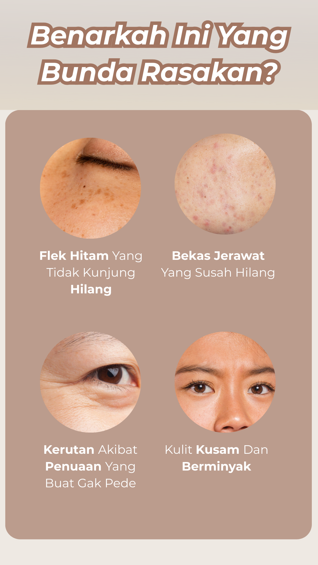 Awas bunda masalah itu harus segera di selesaikan, jangan sampai di biarkan yang nantinya akan makin parah dan harus butuh perawatan yang bisa menghabiskan uang banyak, karena flek kusam dan kerutan itu sebuah hal yang bikin bunda jadi terganggu aktivitas, merasa malu dan kepikiran bertemu orang luar