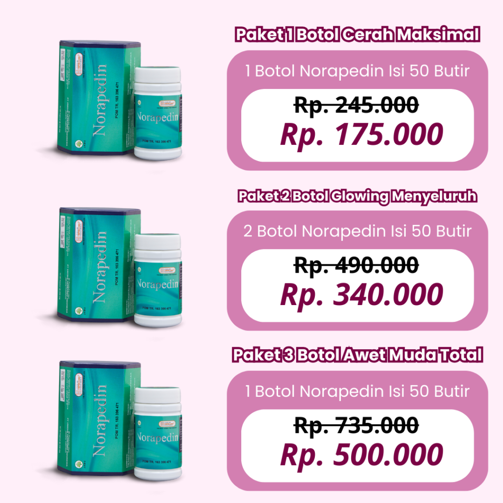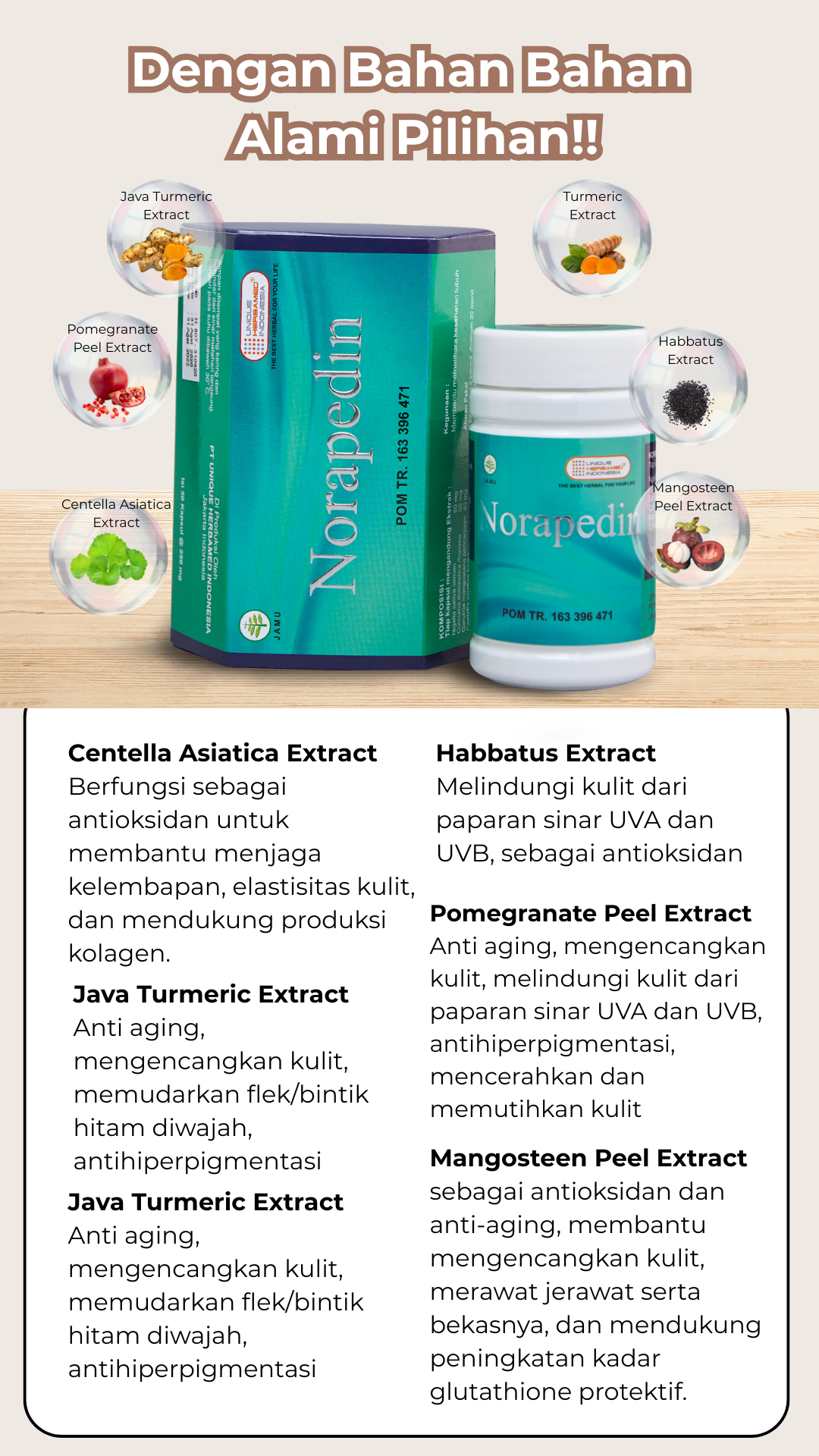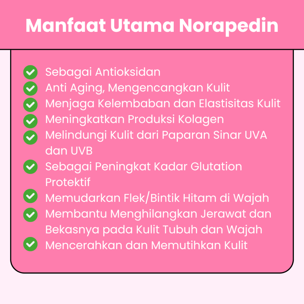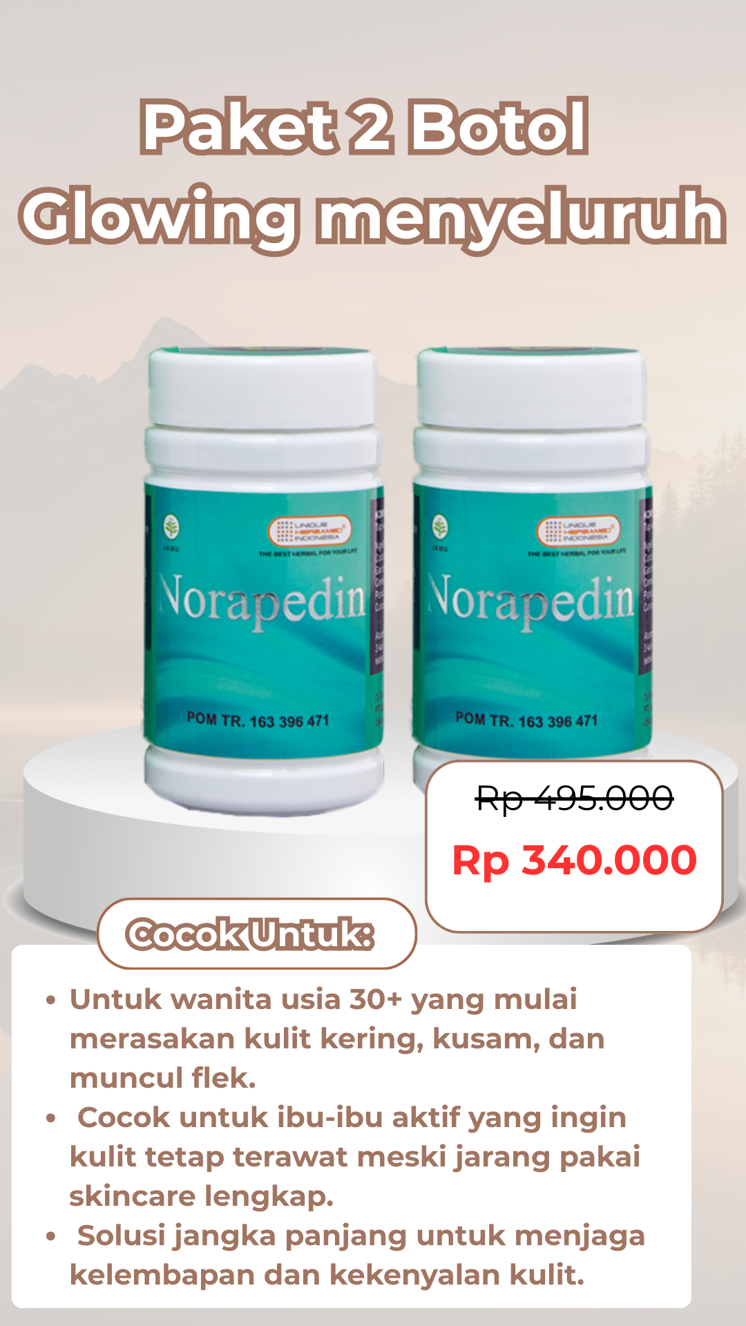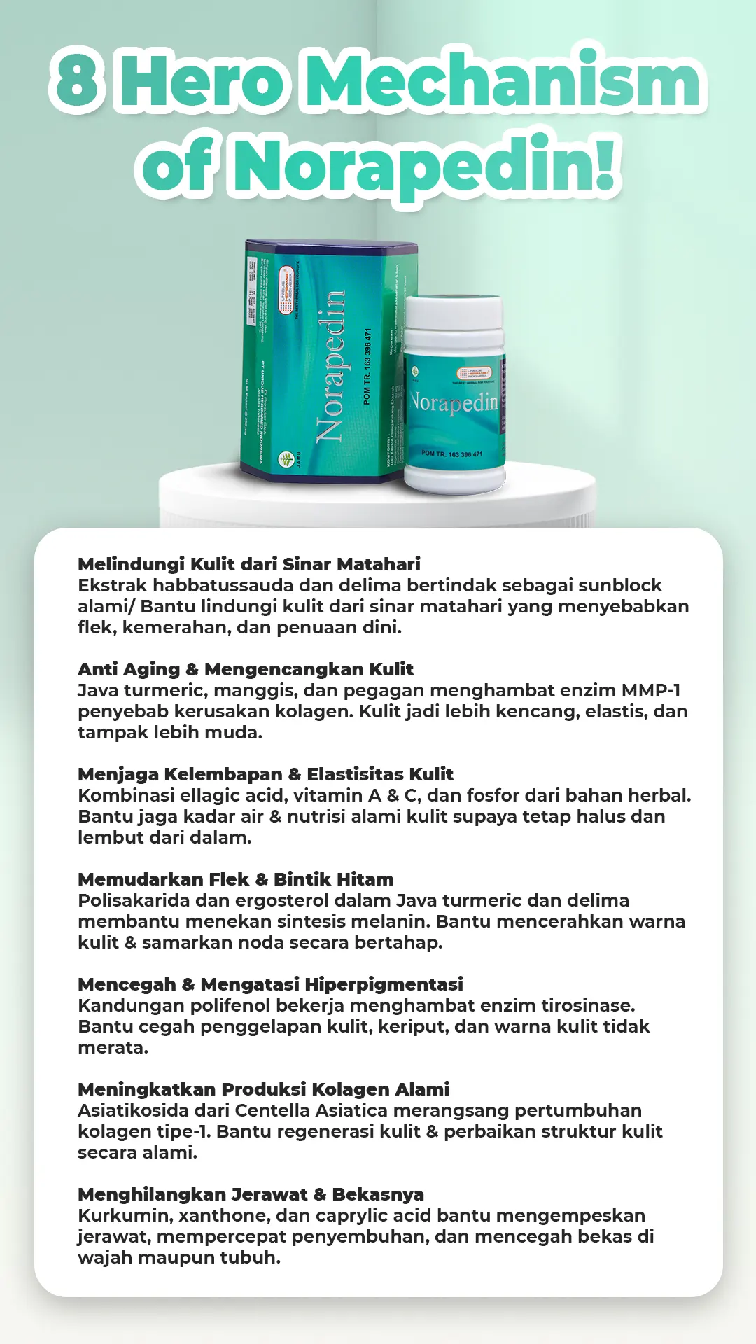 Kaya antioksidan aktif, NORAPEDIN membantu detoks racun, memperbaiki fungsi organ, dan mempercepat regenerasi sel kulit. Hasilnya, kulit jadi lebih cerah, lembap alami, dan tampak awet muda tanpa flek, kerutan, atau kusam.