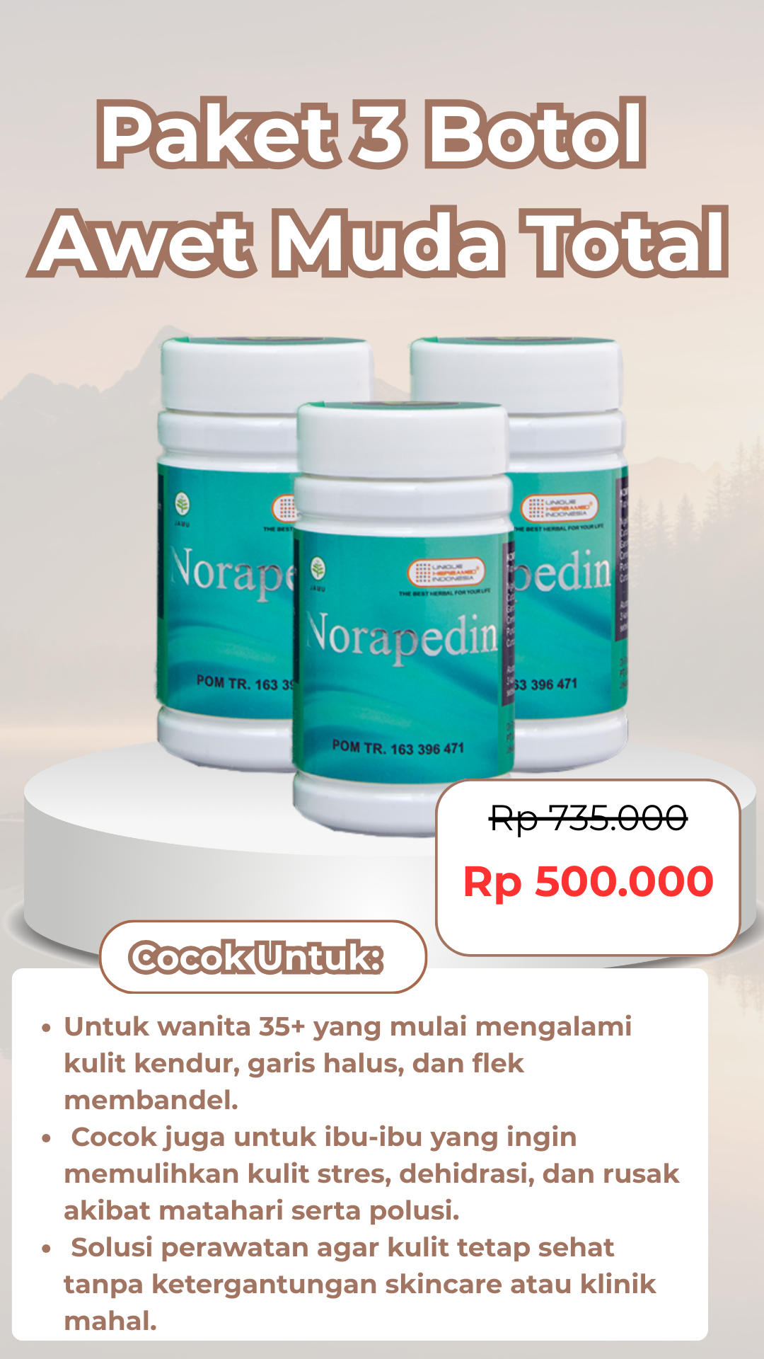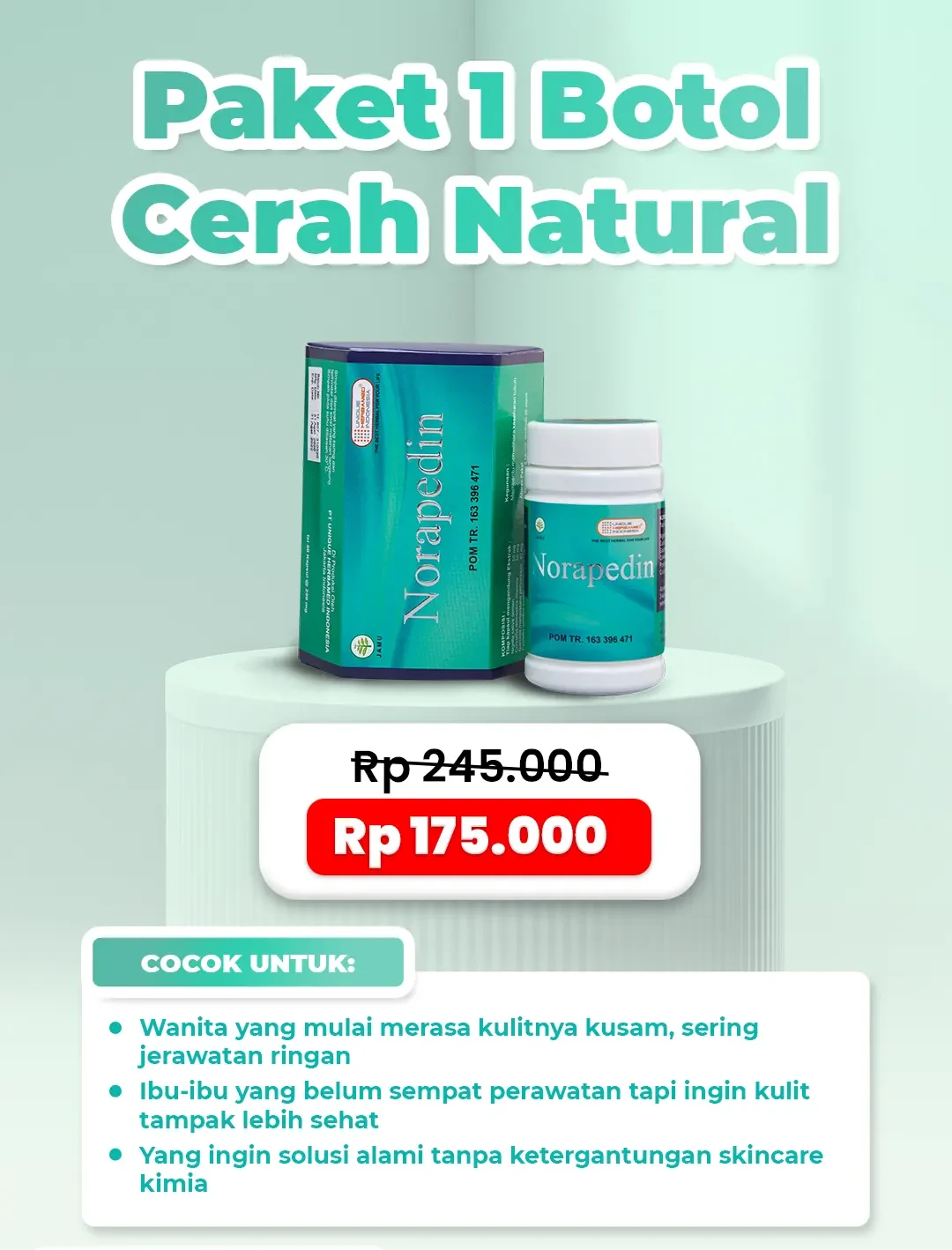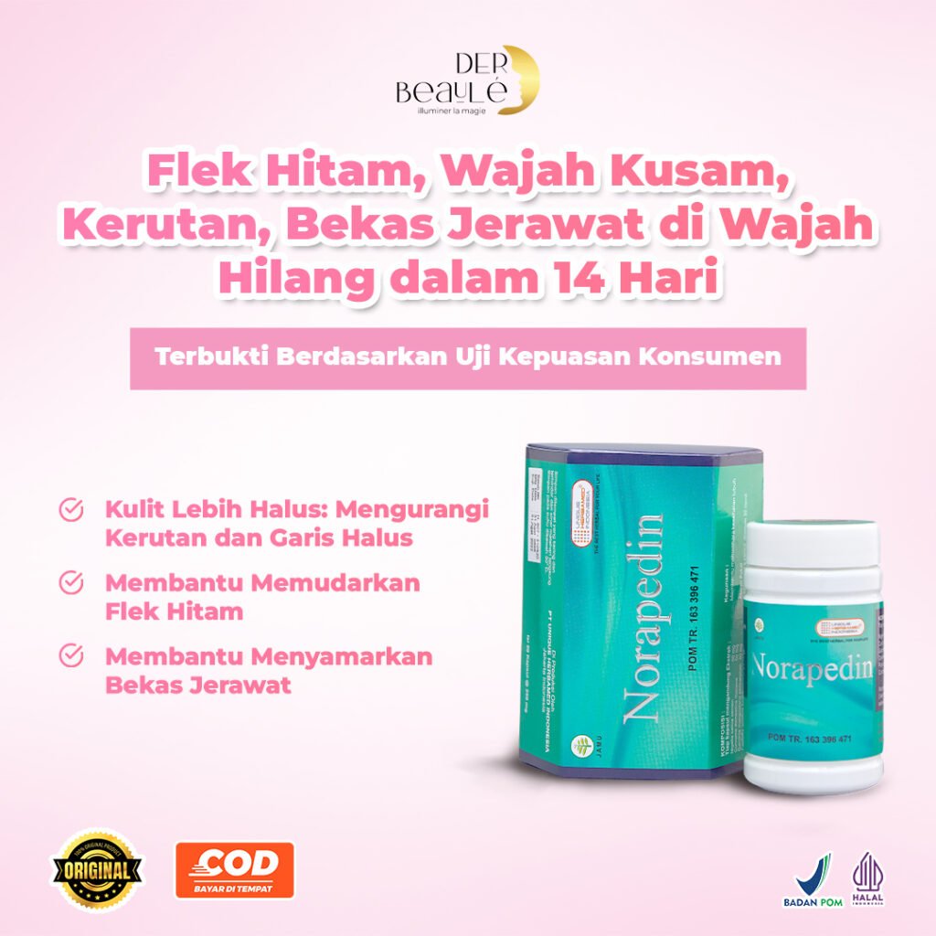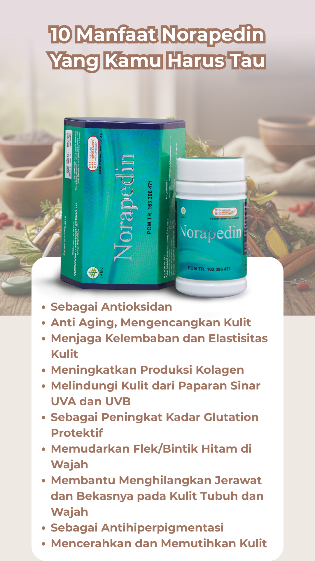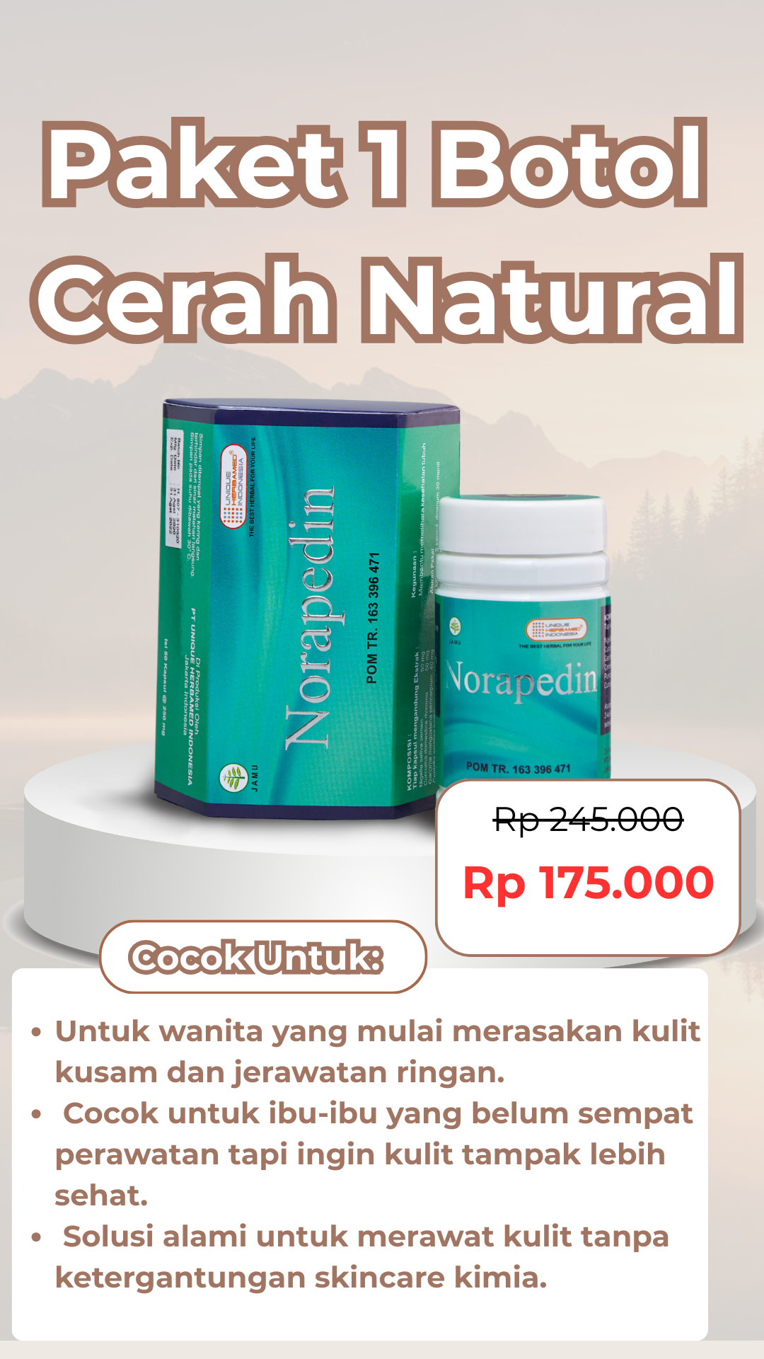 Kaya antioksidan aktif, NORAPEDIN membantu detoks racun, memperbaiki fungsi organ, dan mempercepat regenerasi sel kulit. Hasilnya, kulit jadi lebih cerah, lembap alami, dan tampak awet muda tanpa flek, kerutan, atau kusam.