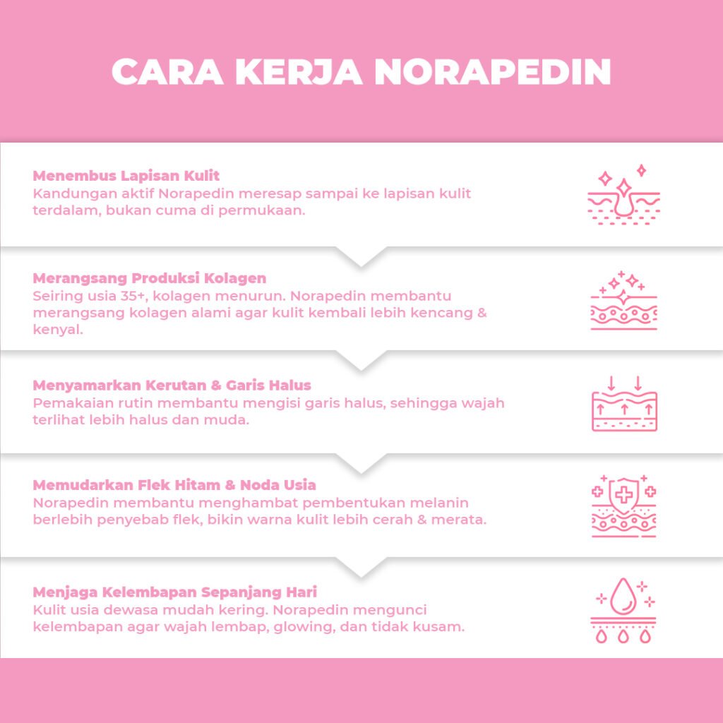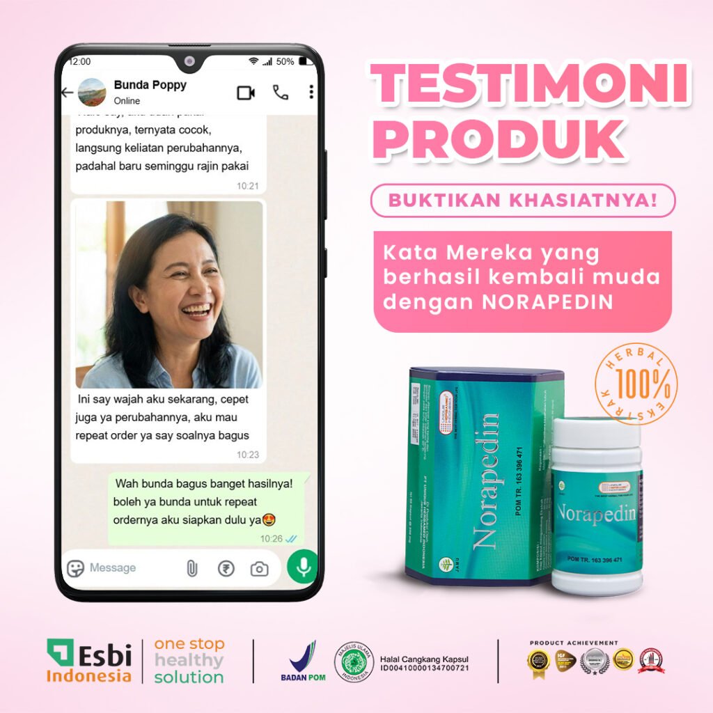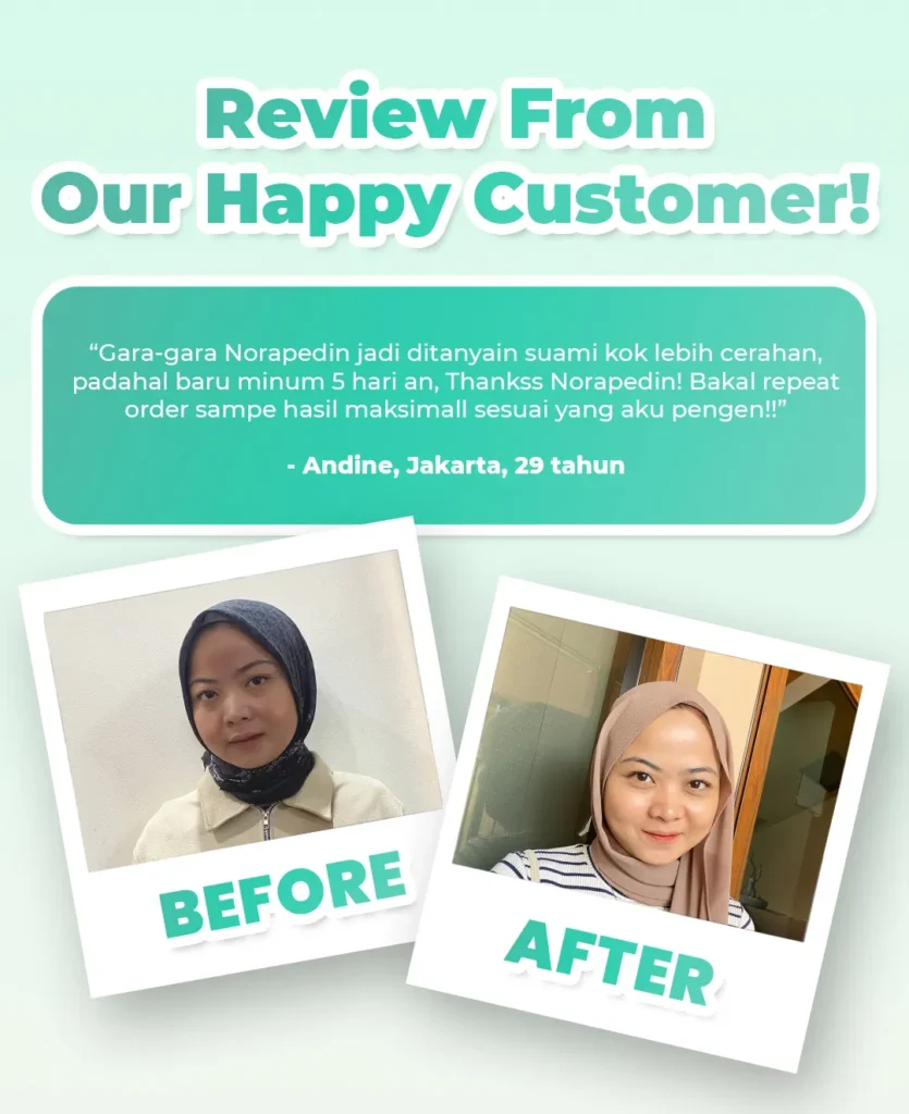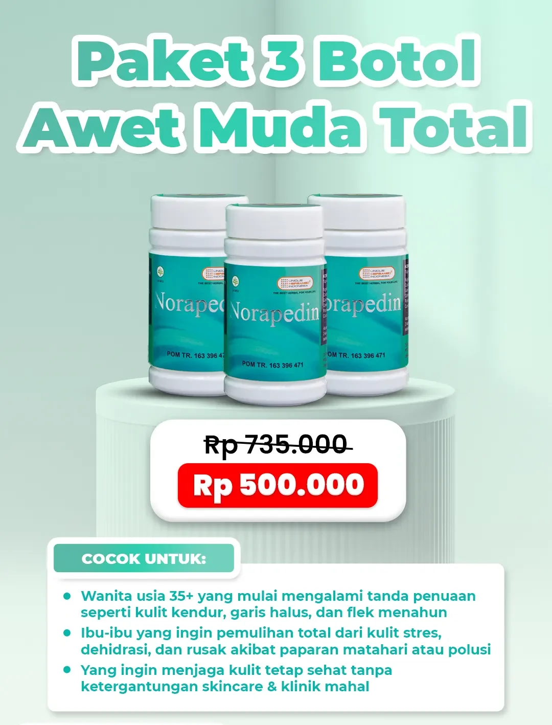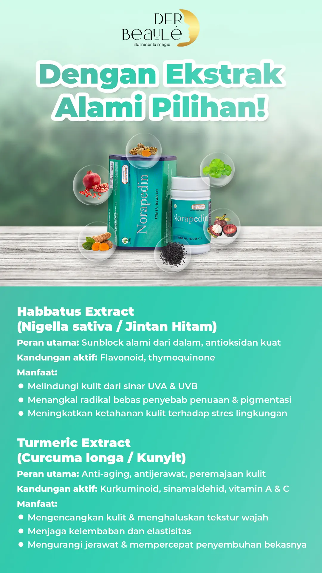 Kaya antioksidan aktif, NORAPEDIN membantu detoks racun, memperbaiki fungsi organ, dan mempercepat regenerasi sel kulit. Hasilnya, kulit jadi lebih cerah, lembap alami, dan tampak awet muda tanpa flek, kerutan, atau kusam.