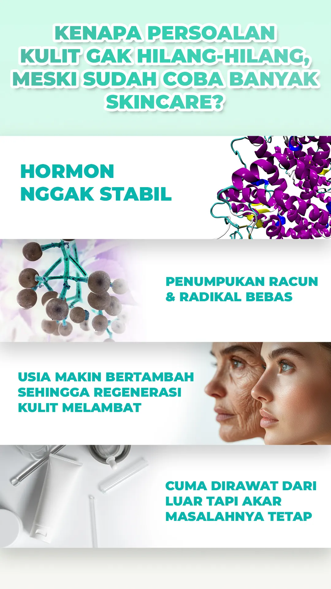 “Skincare tidak mampu menembus sistem detoksifikasi organ tubuh seperti liver & ginjal yang berperan penting untuk kesehatan kulit.”