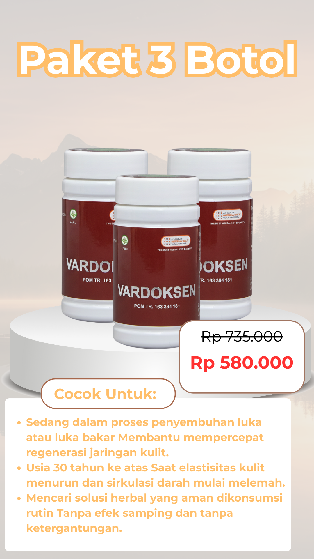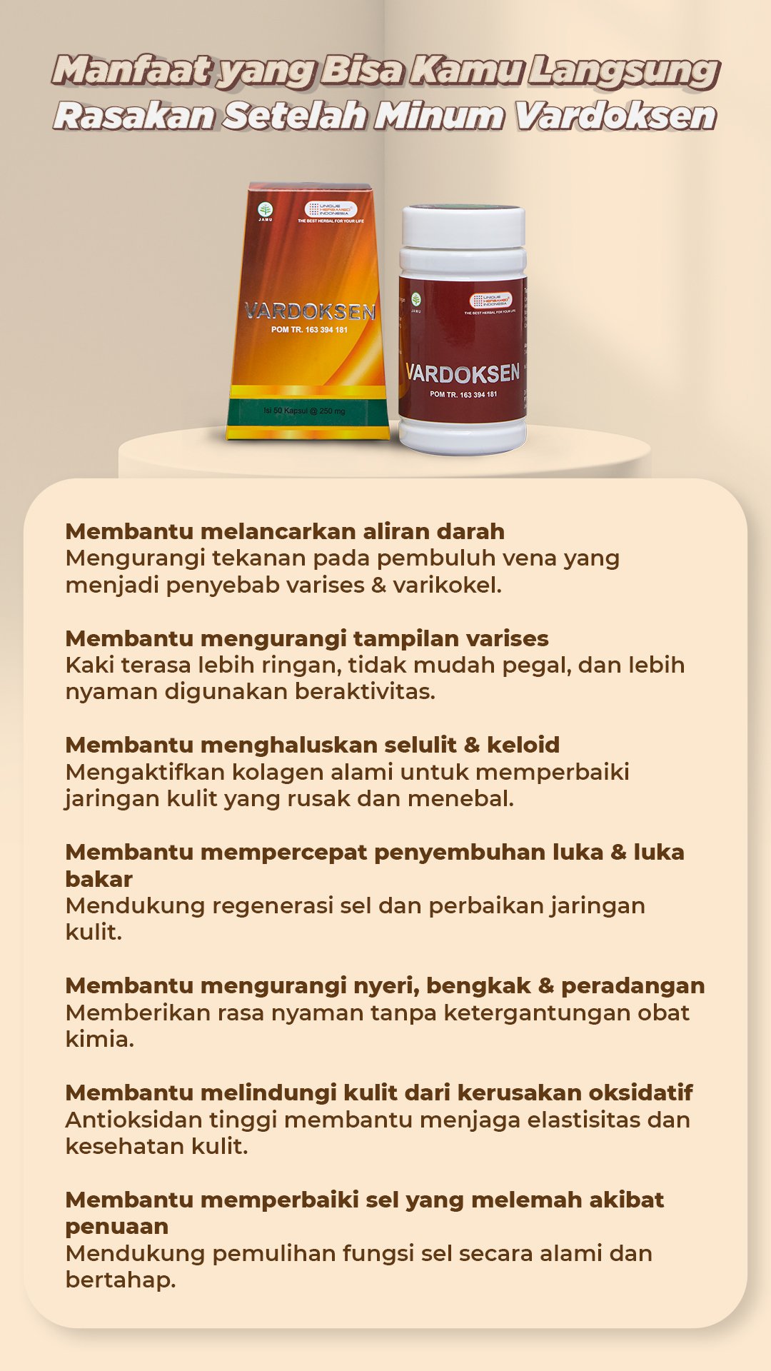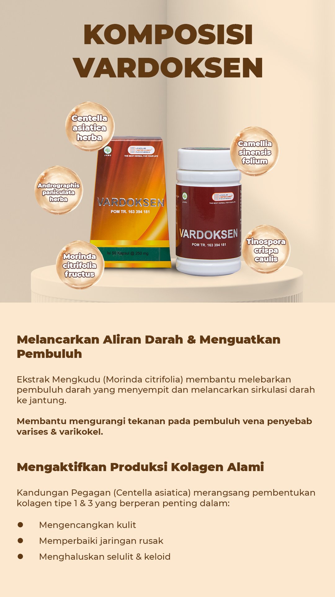 VARDOKSEN adalah herbal medis 100% ekstrak alami terstandar yang membantu melancarkan peredaran darah, memperbaiki jaringan tubuh, dan memulihkan kulit dari dalam.