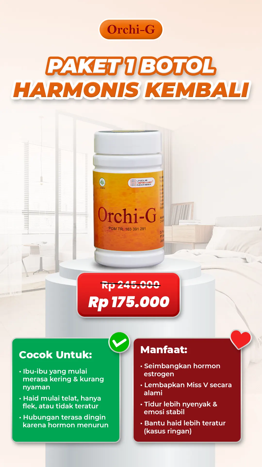 ORCHI-G adalah suplemen herbal khusus wanita yang diformulasikan untuk membantu menjaga keseimbangan hormon dan mendukung kesehatan organ kewanitaan.
