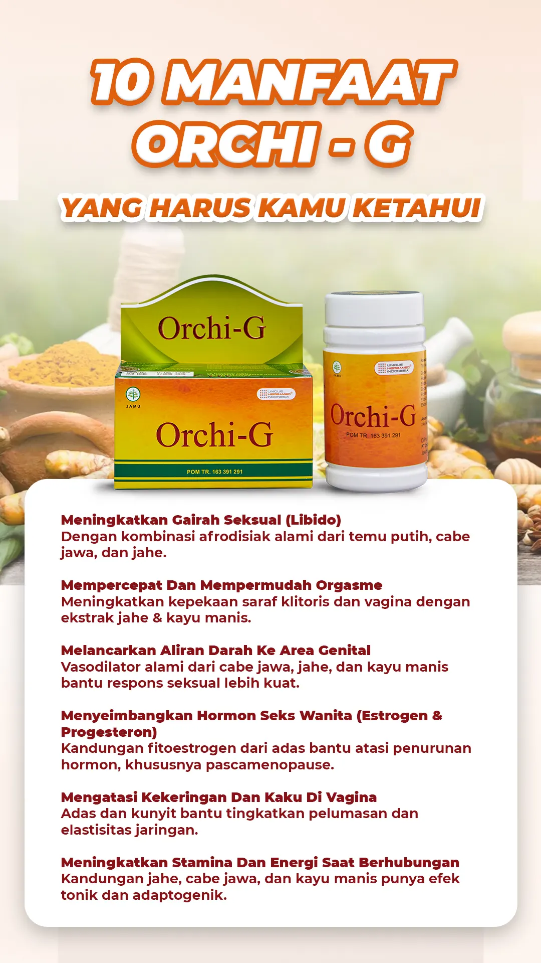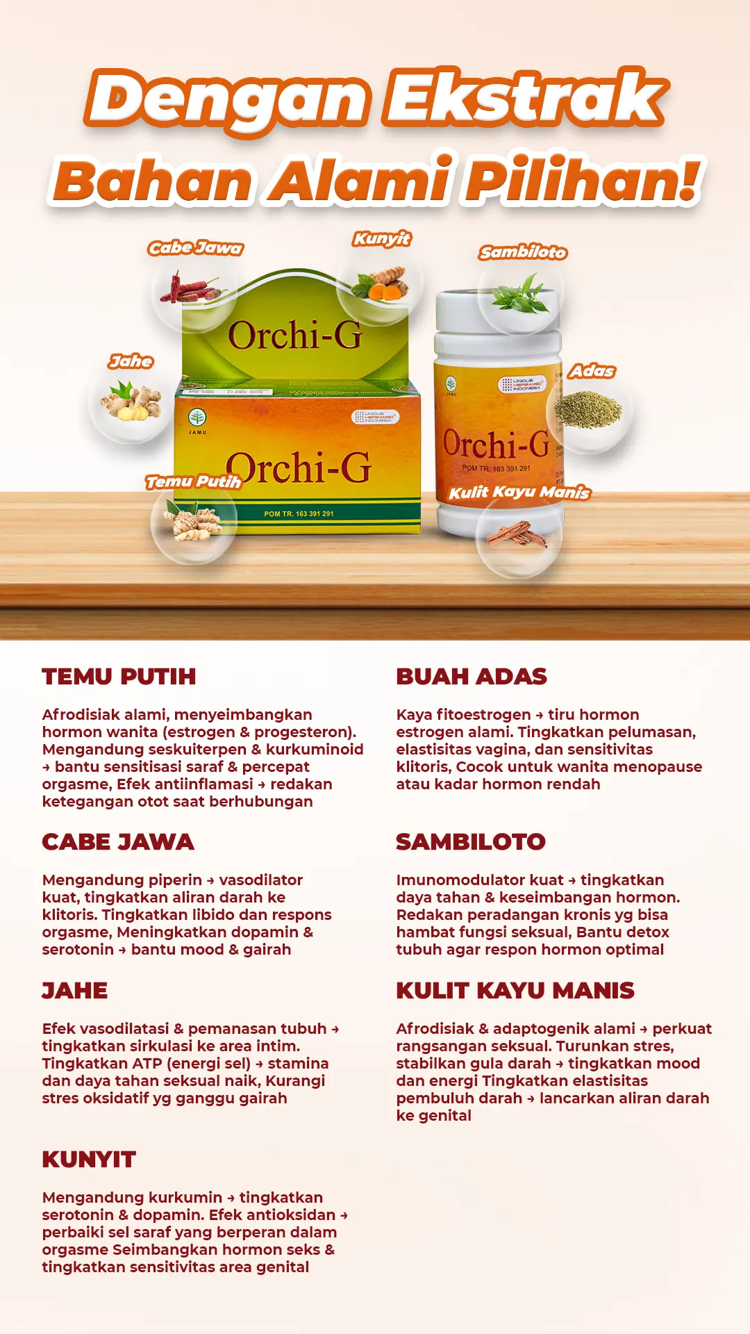 Dirancang dari bahan-bahan alami pilihan, ORCHI-G bekerja dari dalam untuk membantu meningkatkan sensitivitas, menjaga kelembapan alami, dan mengembalikan gairah yang sempat menurun akibat kelelahan, stres, atau faktor usia.
